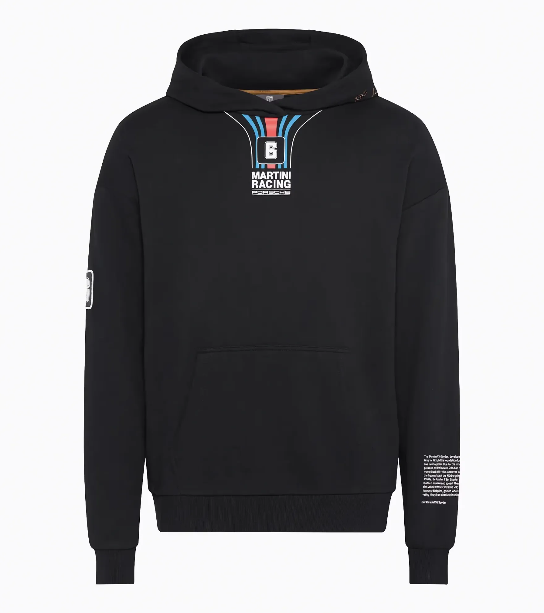 En iyi yarış stili. MARTINI RACING® Koleksiyonunun unisex kapüşonlu sweatshirt'ü, sportif zarafeti efsanevi motor sporları tasarımıyla birleştiriyor. Efsanevi Porsche 936 Spyder'dan ilham alan bu ürün, çarpıcı motor sporları unsurlarıyla özel vurgular sunar: Yakasının altındaki MARTINI RACING® baskısı ve kolundaki ince detaylar, efsanevi yarış tarihini yansıtıyor. Arkadaki tonlu baskı dinamik bir görünüm yaratırken, kapüşondaki yüksek kaliteli 936 Spyder nakışı ve kolundaki 6 numaralı rozet, görünümü mükemmel bir şekilde tamamlıyor.